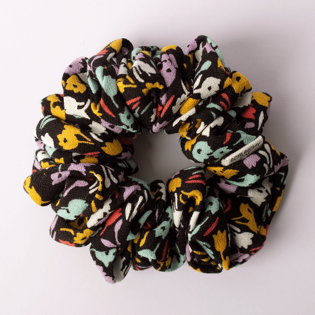 This scrunchy is made using a bold rayon crepe fabric. Lightweight and soft, this fabric creates a bold, floaty scrunchy that has a fun pop of colour.